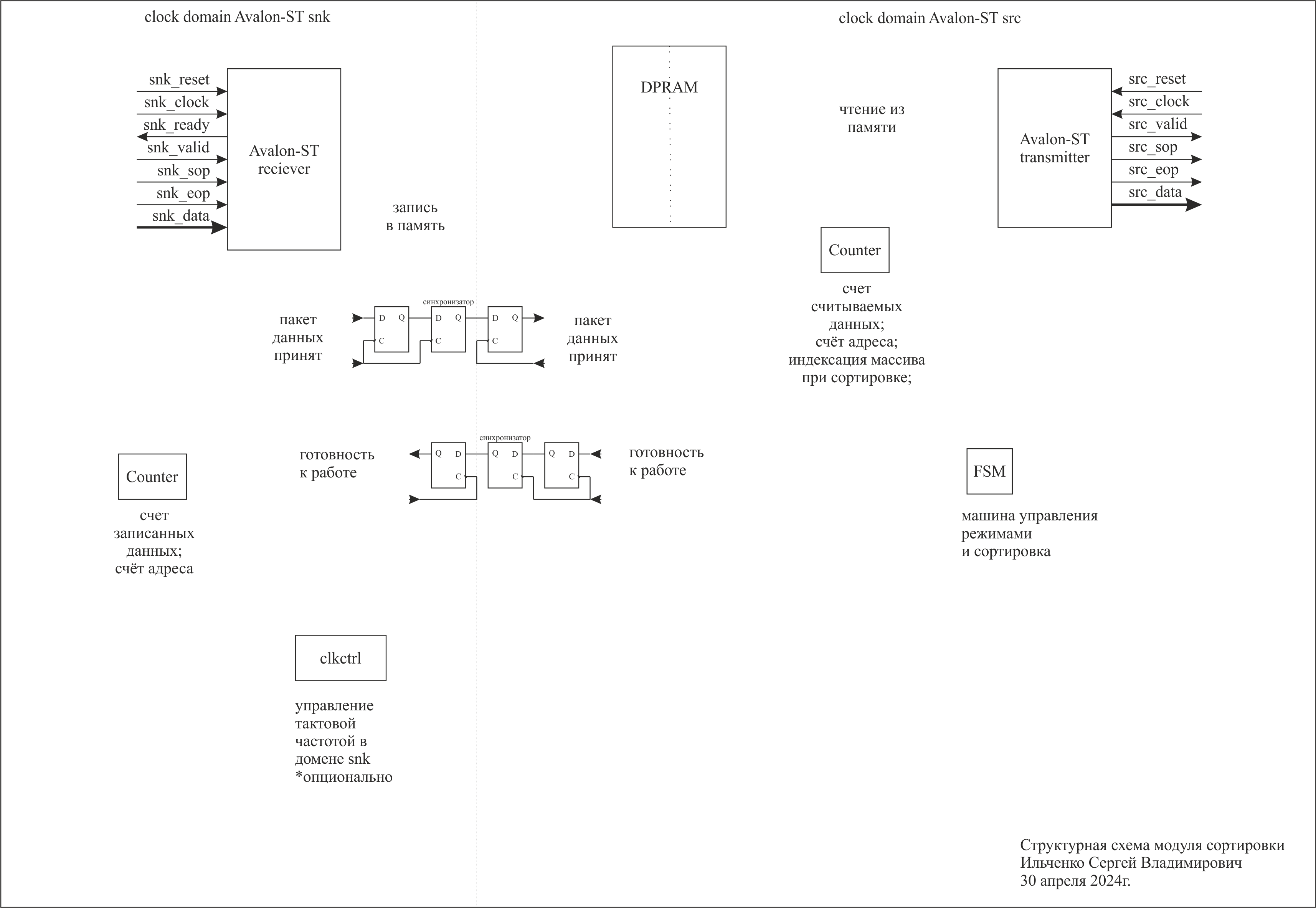 | snk_ready | выход | Сигнал готовности входного потокового интерфейса. Если 0, то модуль не готов принимать новую транзакцию (занят сортировкой или отправкой выходной транзакции и пр.) |